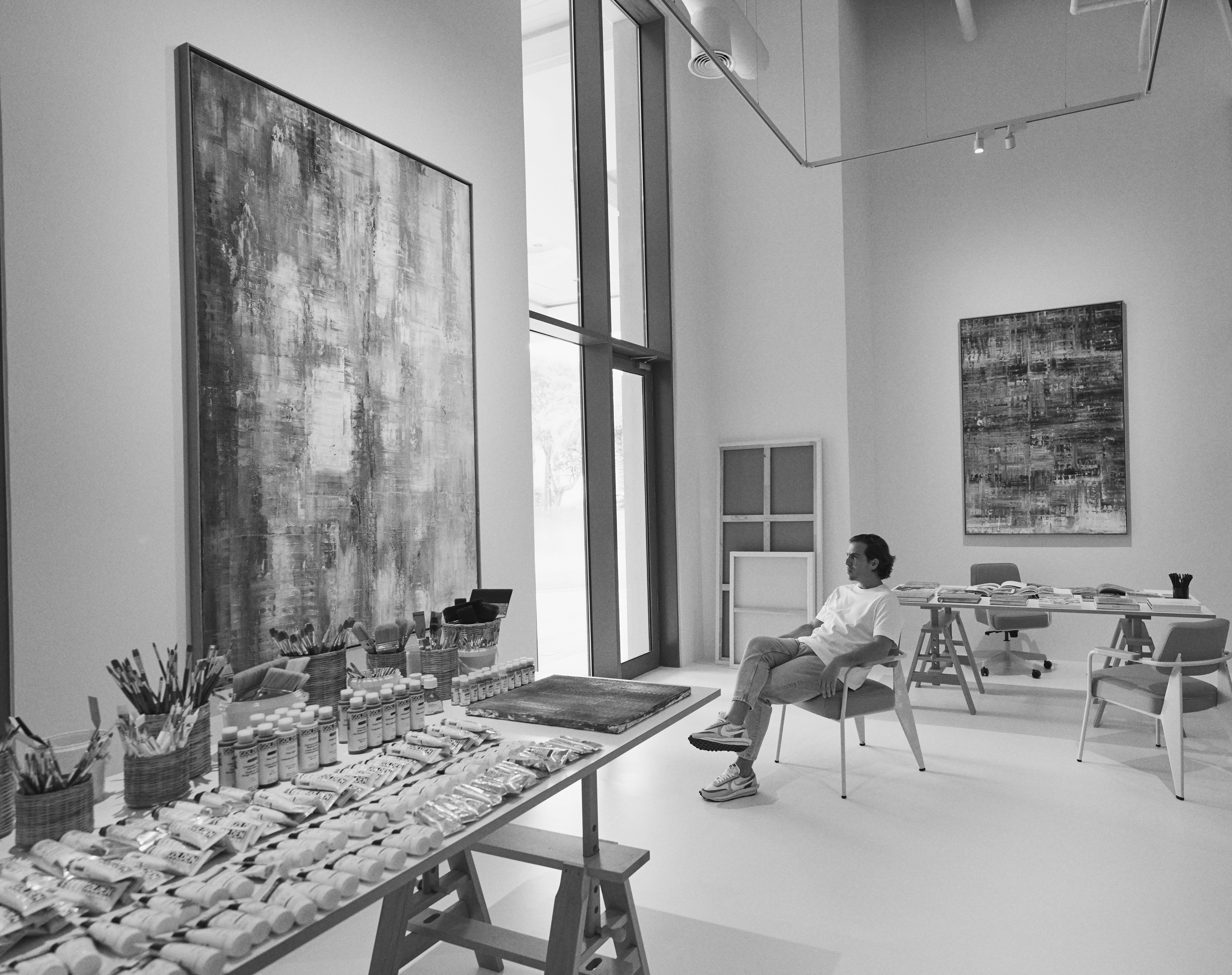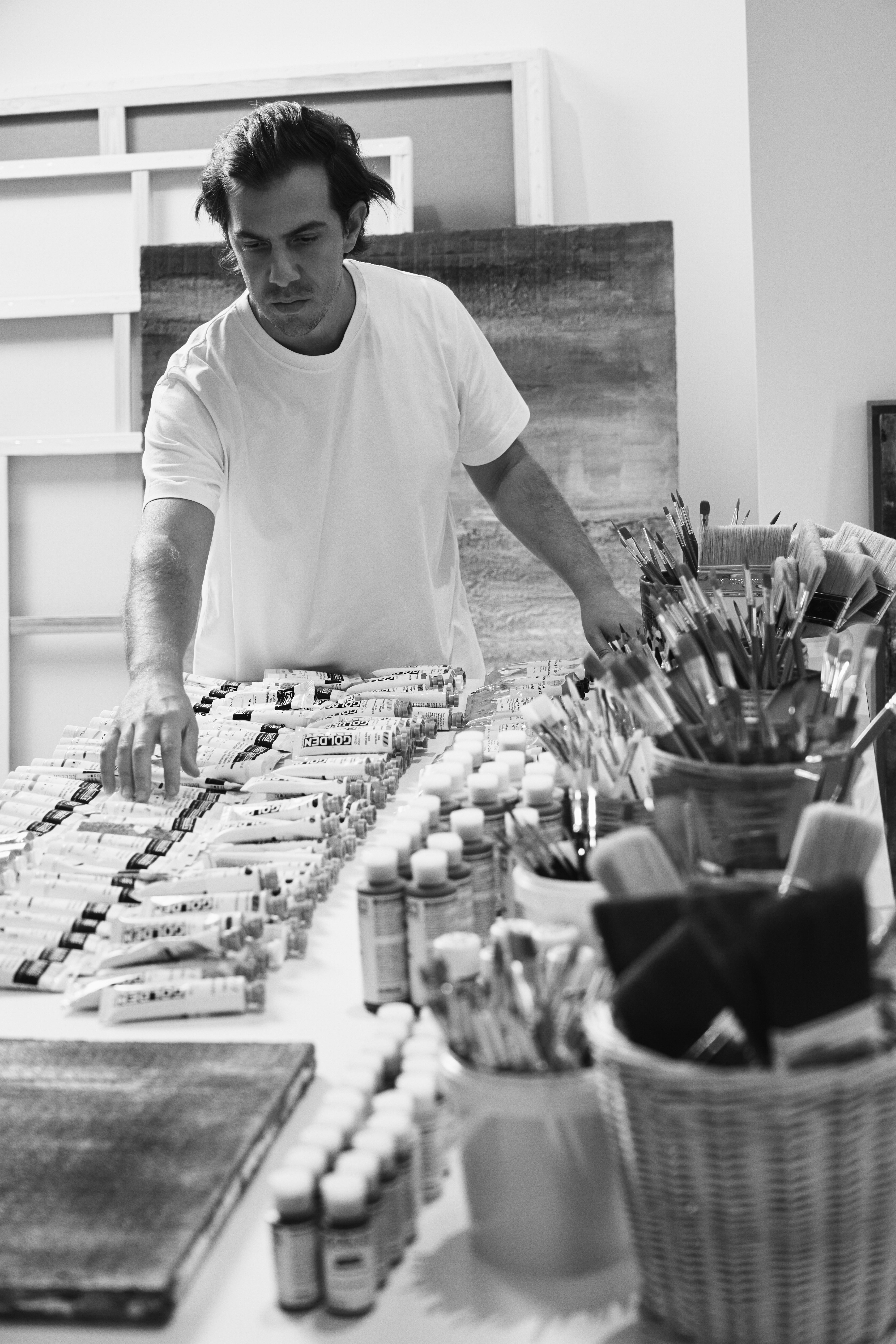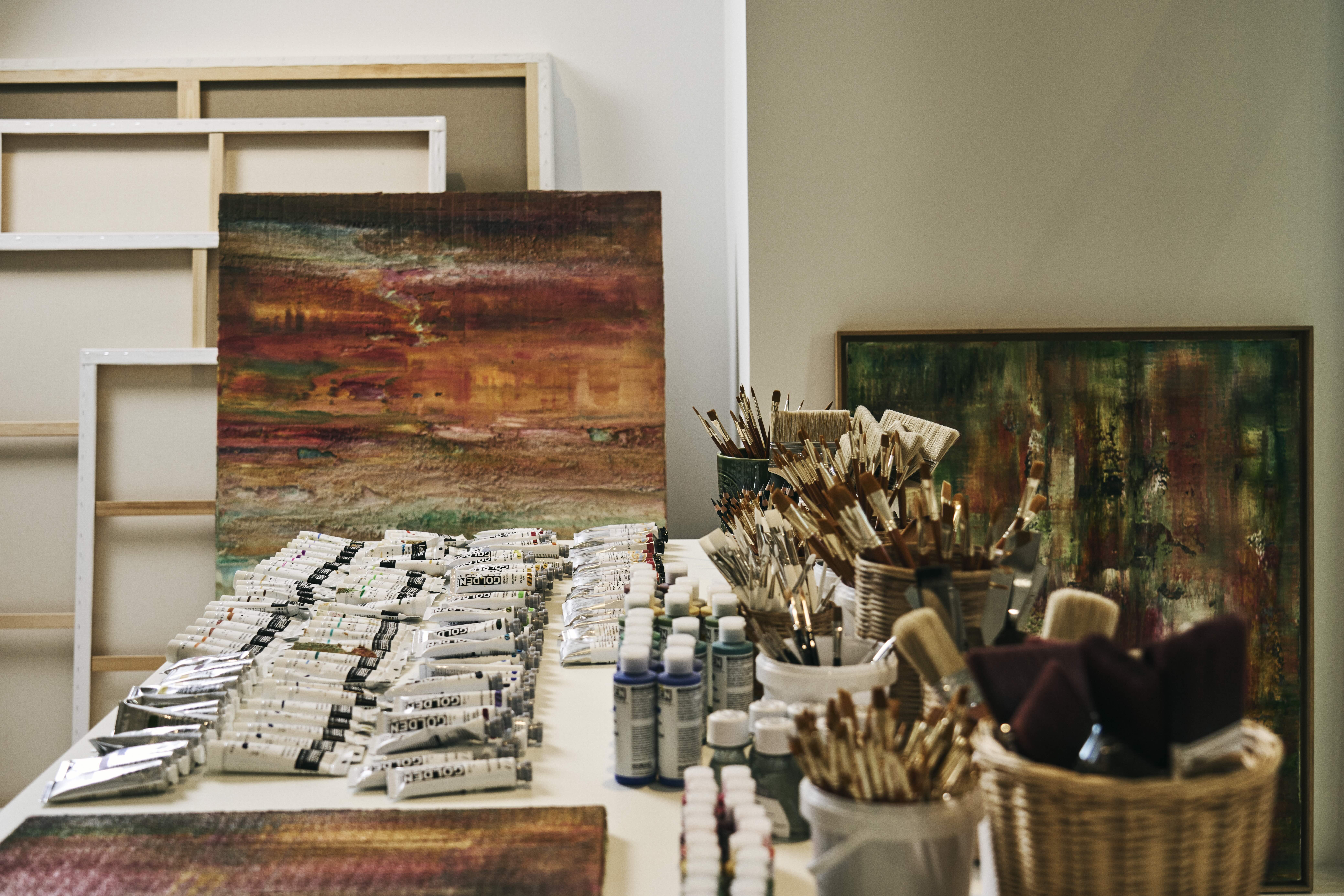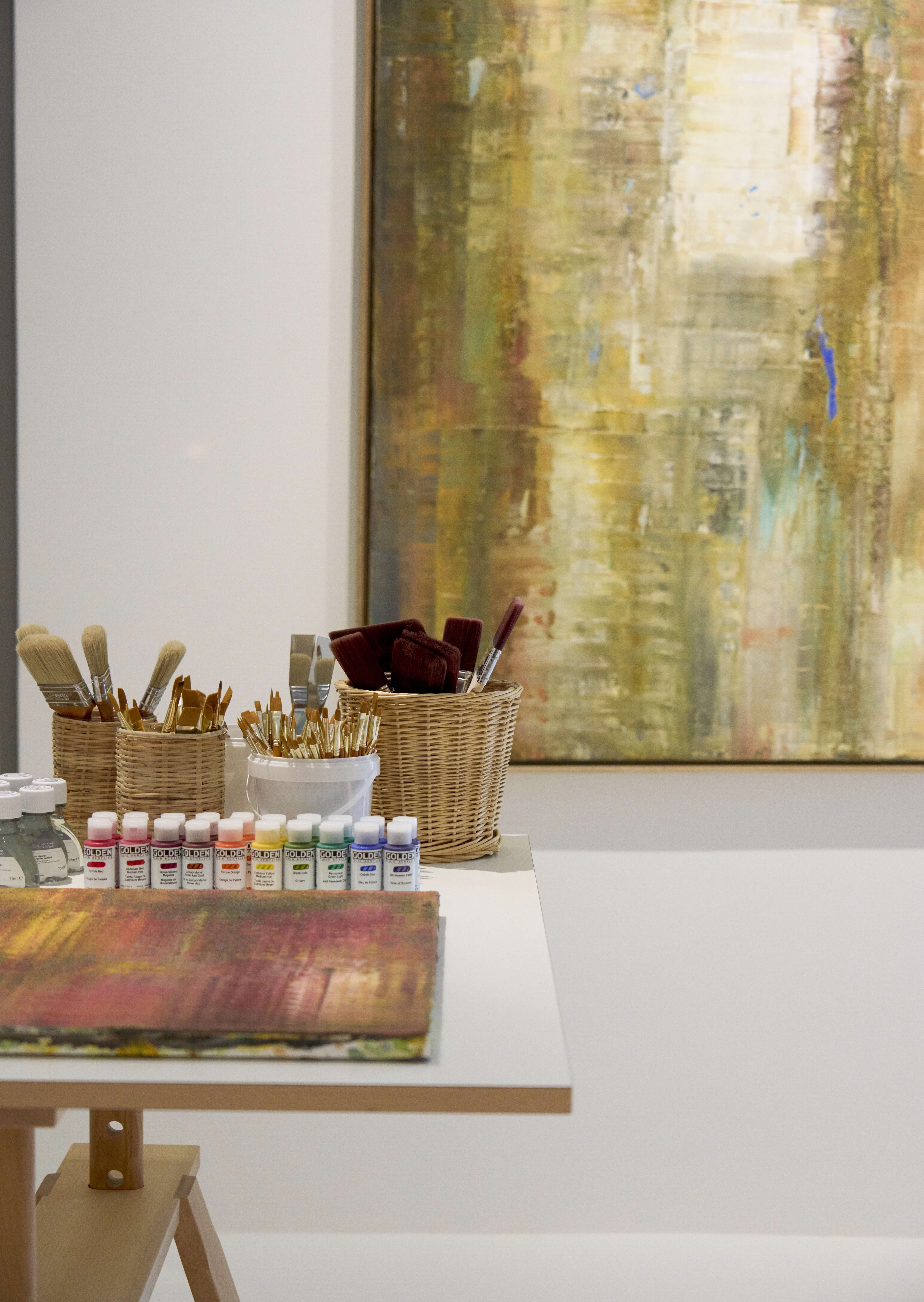 Sassan Behnam-Bakhtiar’s Doha studio, showcasing the oils he uses to create his signature style of peinture raclée